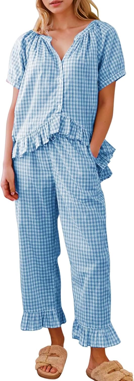 Womens 2 Piece Gingham Pajamas Set Cute Plaid Pjs Cotton Short Sleeve Babydoll Shirt Ruffle Pants Lounge Sets