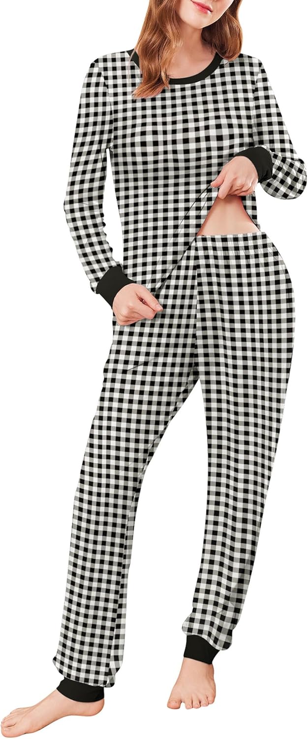 - 【Plaid Pajama set】Long sleepwear set all d in eye-catching classic plaid to create women’s soft and cozy pj set,round neck & long sleeve & elasticity is great for women to sleepwear/lounge wear/underwear